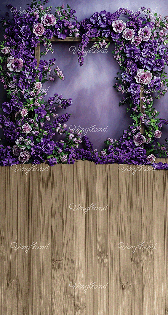 Tło fotograficzne: Instalacja z fioletowych kwiatów na drewnianej ramie - Kwiaty - F34