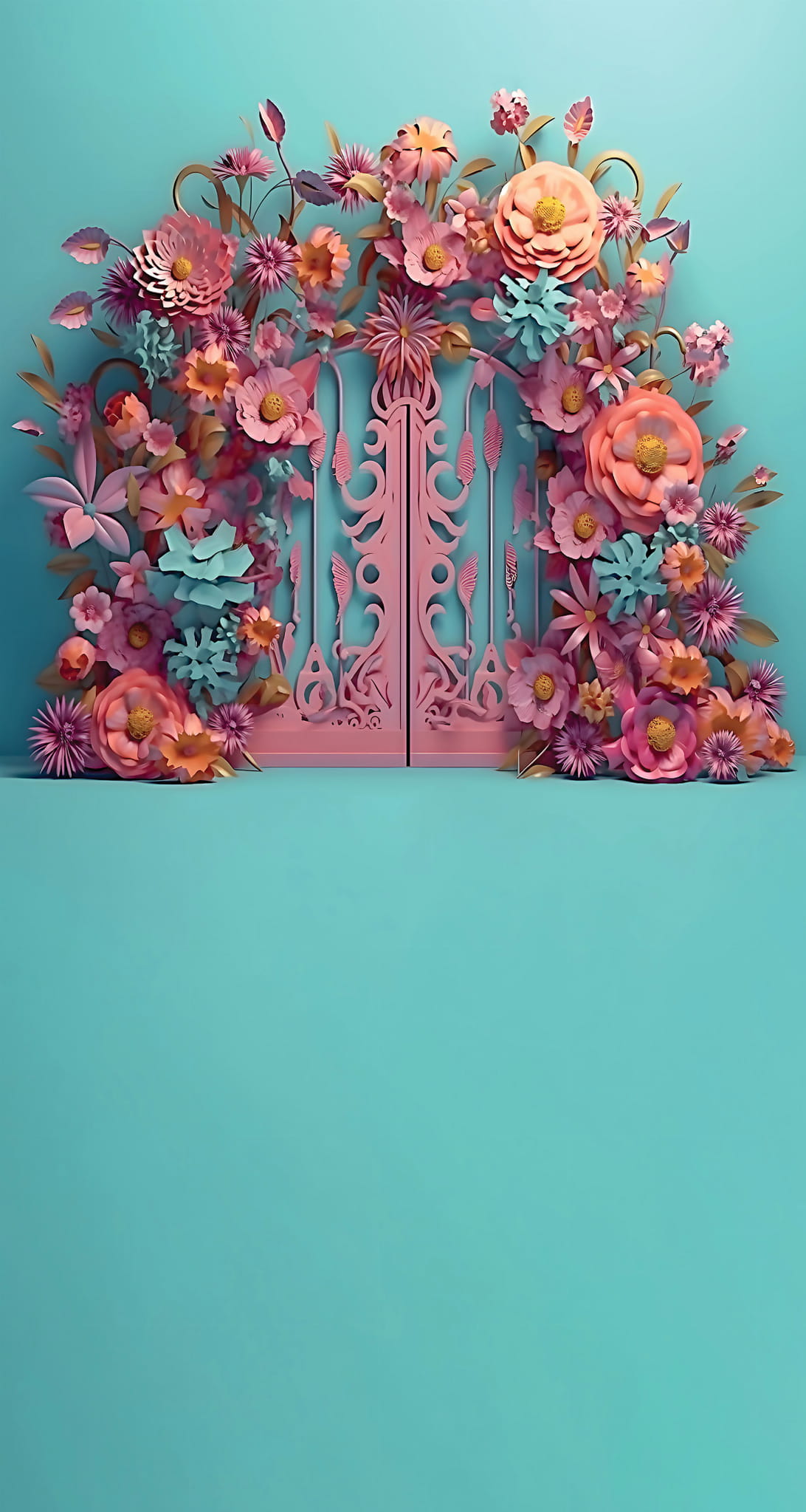Tło fotograficzne: Ukwiecona brama na turkusowym tle - Kwiaty - F28